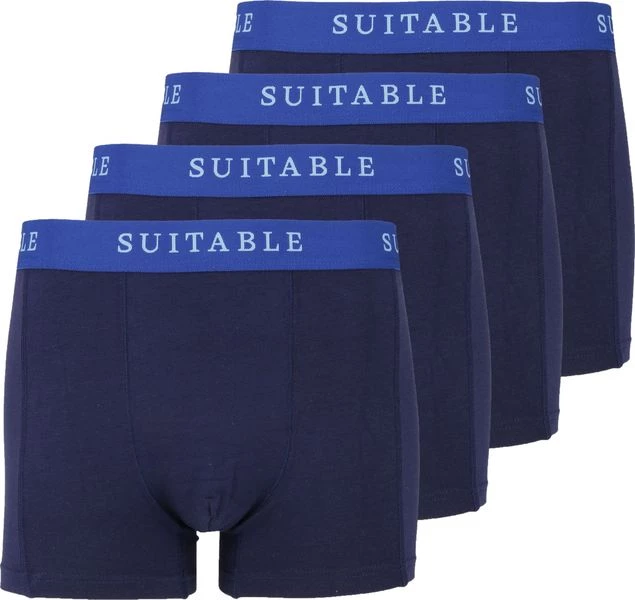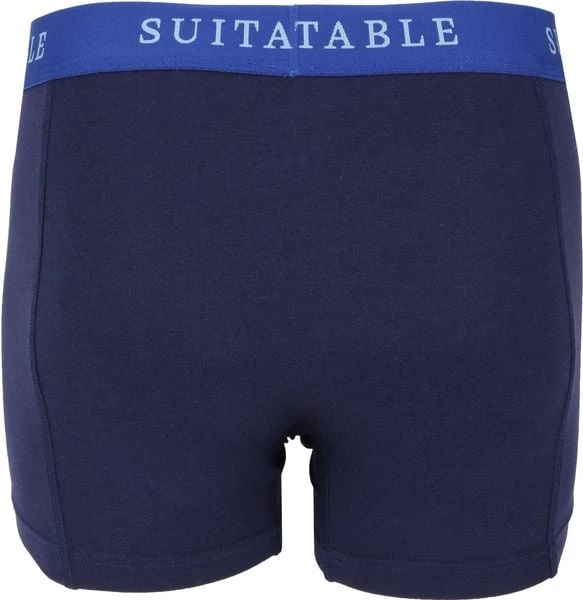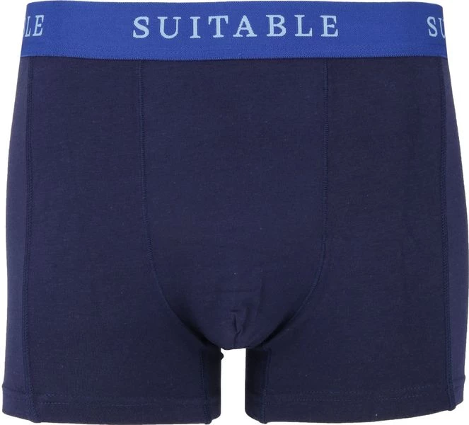 De boxers hebben een tijdloze donkerblauwe kleur en zijn voorzien van een kobaltblauwe elastische band waarop in stijlvolle letters Suitable staat.