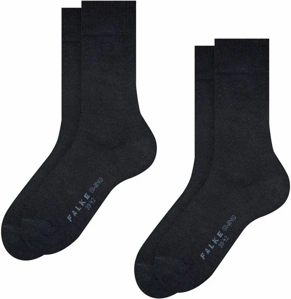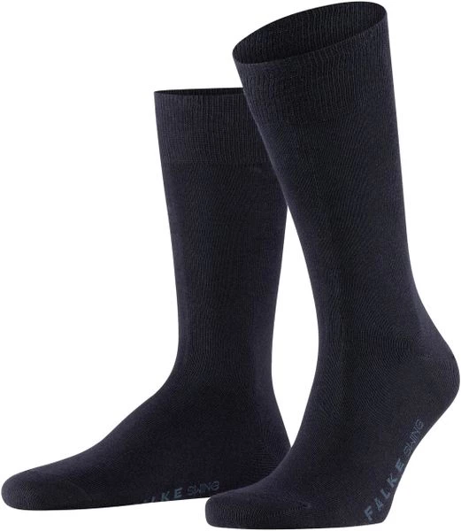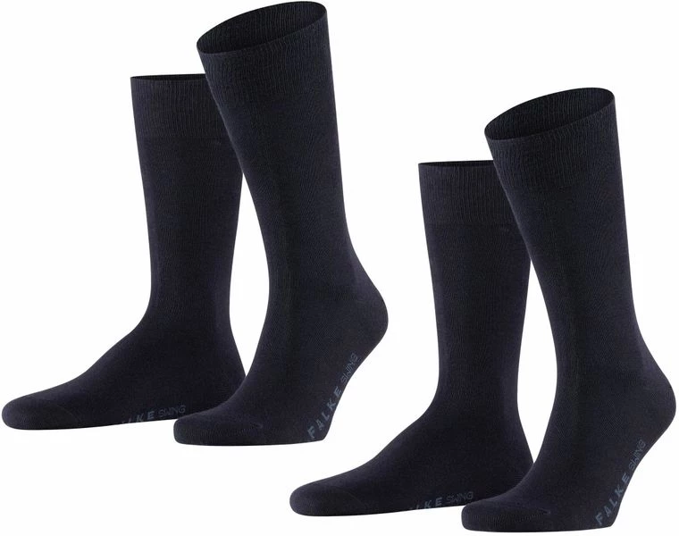 Falke Swing sokken: Een allround herensok van een gemiddelde dikte in de goed te combineren donkerblauwe kleur. Optimale steun dankzij versteviging bij de belaste zones en gemaakt van zacht katoen met elastaan (stretch) en polyamide waardoor hij zeer comfortabel draagt en fris blijft. Het hoge katoengehalte en de neutrale kleur zorgen er voor dat de kous bij elke gelegenheid kan worden gedragen. Duidelijk herkenbaar door ingebreide maten in de zool en een perfecte pasvorm door elestaandraden.